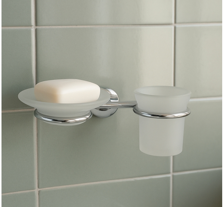 Accessoire de salle de bain multifonctionnel pleine d'un verre pour brosse à dents et du savon, à la fois dans le verre dépoli. Le porte-savon et verre royaume-uni en Ligne de Vague IdeArredoBagno ne sert pas uniquement à l'ordre de la salle de bain, mais avec l'élégance de sa ligne ne néglige pas le style, parce que la personnalité de l'espace, vous pouvez voir les détails de l'ameublement.