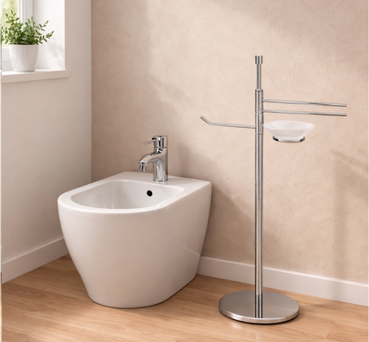 PIANTANA FREE STANDING COMPOSTA DI PORTA SALVIETTE DA BIDET, PORTA CARTA E PORTA SAPONE, ELEMENTI ROTABILI