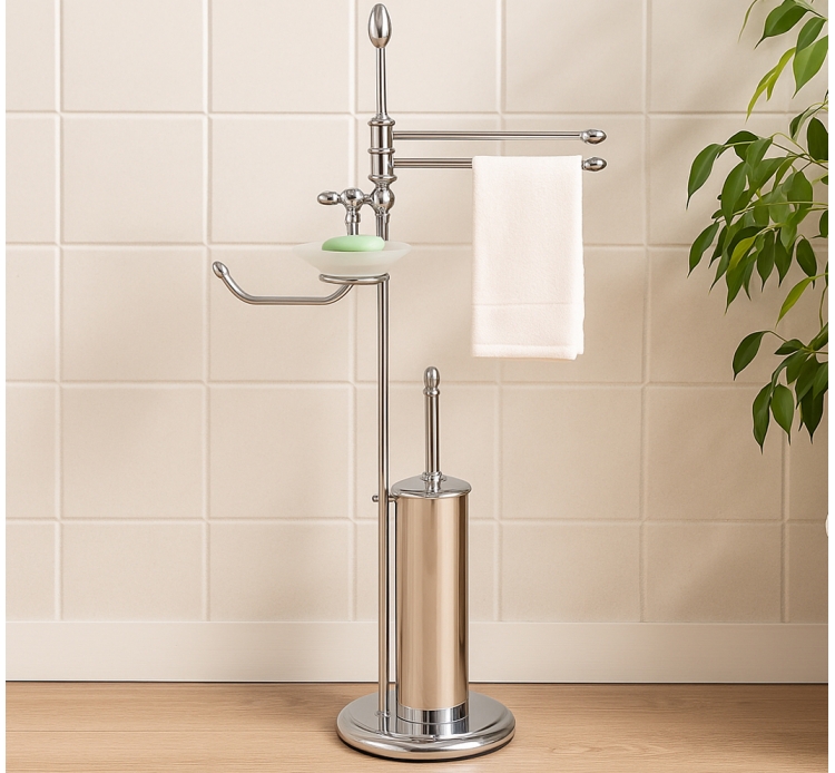 Piantana porta carta, porta salviette, sapone e scopino wc, realizzata in ottone di alta qualità